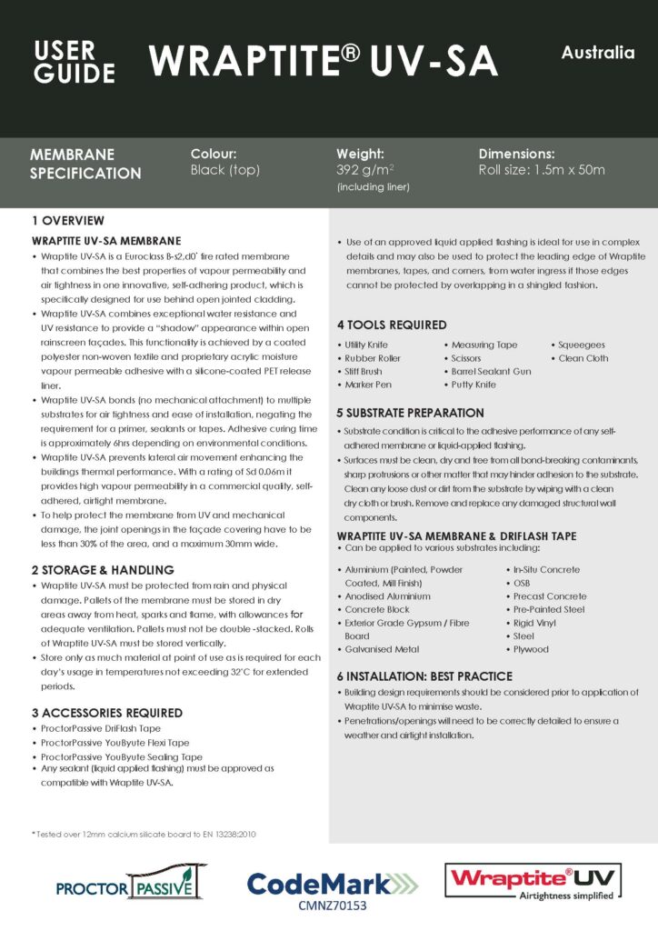 ProctorPassive Wraptite UV-SA combines all the best properties of a UV resistant vapour permeable water and air barrier membrane in one innovative self-adhering product designed for use behind open jointed cladding. Wraptite UV-SA utilises a patented full coverage vapour permeable adhesive to provide high vapour permeability.
